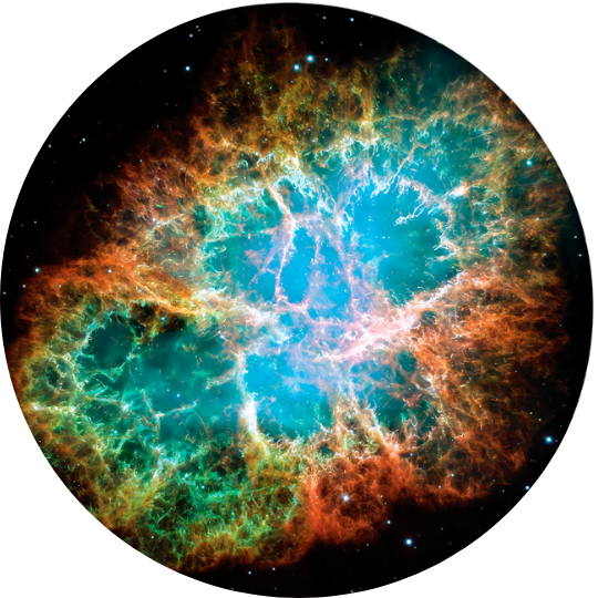 The printed artwork is Crab Nebulae, a circular abstract interpretation of a stellar explosion. The radiating filaments and glowing hues express expansion and energy, offering a detailed view of cosmic transformation.