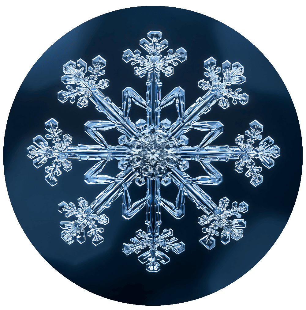 The printed art is Fractal, a snowflake design with complex geometric patterns, represented in a round format that enhances its fractal beauty. Its intricate structure creates a sophisticated and modern decorative accent.