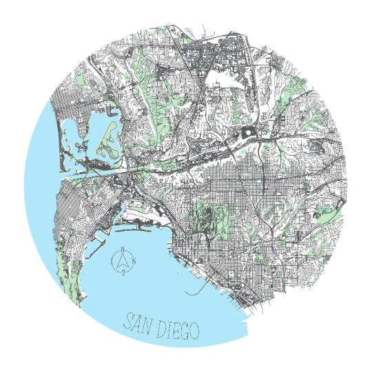 The printed art is San Diego City, coastal and luminous, represented in a round format that highlights the relaxed yet structured essence of its map design. A perfect balance between energy and tranquility.